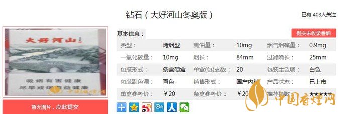 以上便是由香煙網(wǎng)小編為大家介紹的關(guān)于鉆石大好河山冬奧版價(jià)格及參數(shù) 獨(dú)家口感分析的相關(guān)信息,想要了解更多有關(guān)內(nèi)容請點(diǎn)擊:全球十大女士香煙品牌排行榜 精心整理全新首發(fā)