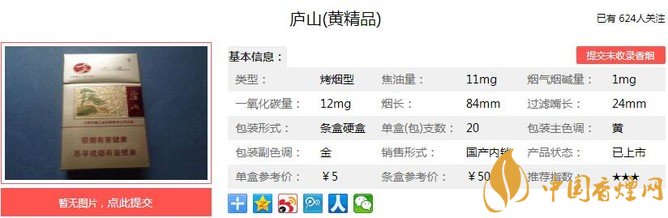 廬山黃精品煙支長84mm,過濾嘴長24mm;包裝簡約典雅,廬山的圖案有一種類似工藝畫的感覺。下面我們一起來看廬山黃精品的參數信息:焦油量:11mg 煙堿量:1mg 一氧化碳量:12mg