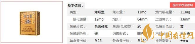 類型 :烤煙型 焦油量 :11mg 煙氣煙堿量 :1.1mg 一氧化碳量 :12mg