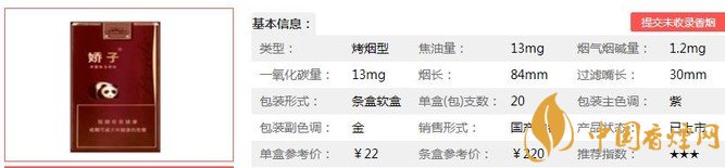 嬌子軟紫國寶煙支長84mm,過濾嘴長:30mm,該款產品采用了具有自主知識產權的復合生化減害技術,能夠明顯降低煙氣中的有害物質。下面我們一起來看嬌子軟紫國寶的參數信息:焦油量:13mg 煙堿量:1.2mg 一氧化碳量:13mg