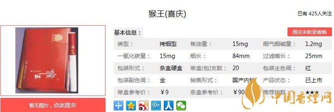 喜慶的配方很有特色,煙葉來自全國各煙草生產基地,以及進口津巴布韋的高檔煙葉,精心配制而成,嚴格控制焦油量和眼草酸堿度,口感清新幽香,余味醇厚。總體質量比較不錯,值得一品。經香煙網小編市場調查猴王喜慶售價為9元/包。