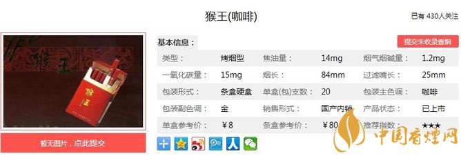 配方有科學(xué)配伍13種健脾解毒的中草藥添加劑,凝結(jié)“中式卷煙”之精華,最大程度地降低吸煙對人體的危害。高品質(zhì)的進口煙葉與云、貴等地國產(chǎn)優(yōu)質(zhì)煙葉合理、完美結(jié)合,用最先進的設(shè)備精工細(xì)做。經(jīng)香煙網(wǎng)小編市場調(diào)查猴王咖啡售價為8元/包。