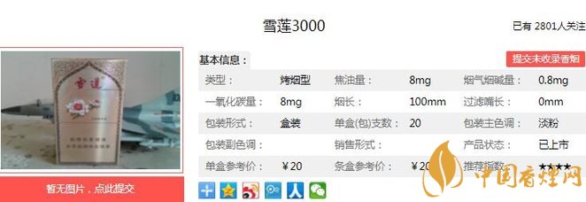 雪蓮3000煙支長100mm,過濾嘴長不詳,在制作工藝上,結合葉組配方原料的理化和加工特性,集成定制切絲寬度技術、高溫增香技術等特色工藝技術,形成與之配套的“超細支低焦油卷煙個性化制絲工藝加工核心技術”。下面我們一起來看雪蓮3000的參數信息:焦油量:8mg 煙堿量:0.8mg 一氧化碳量:8mg