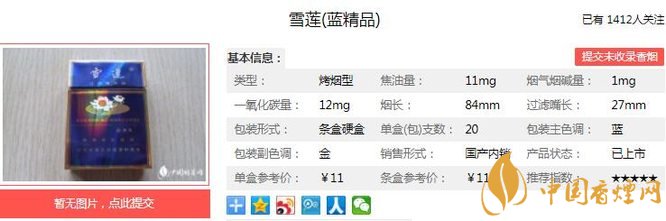 雪蓮藍精品煙支長84mm,過濾嘴長27mm,優選國內優質煙葉,應用高分子合成技術等多項現代工藝技術精制而成;香氣自然、高雅,余味醇厚、干凈舒適。下面我們一起來看雪蓮藍精品的參數信息:焦油量:11mg 煙堿量:1.0mg 一氧化碳量:12mg