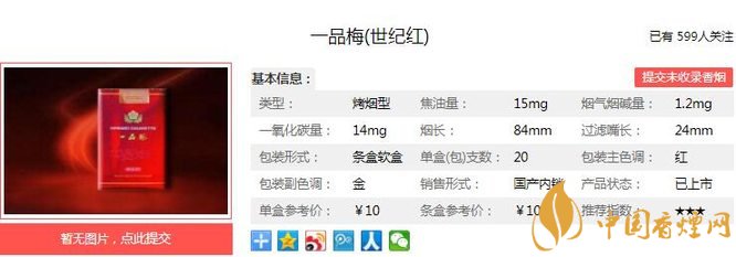 一品梅世紀紅設計兼顧了卷煙健康消費需求,采用了多項創新技術。降低一氧化碳含量,大大降低了卷煙危害性,充分體現了卷煙健康消費需求。經香煙網小編市場調查一品梅世紀紅售價為10元/包。