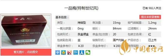 品梅世紀風煙氣甜韻圓潤、柔綿舒適、入喉清新豐滿、順暢、醇綿、飽滿、輕靈,此煙還是很不錯的,口感著實純正飽滿,醇厚干凈。經香煙網小編市場調查一品梅世紀風售價為20元/包。