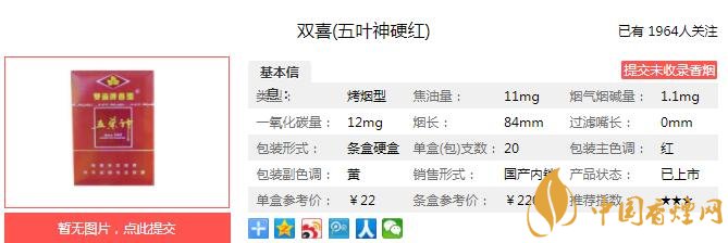 作為中式卷煙的代表,精選3年自然醇化的國內外上等煙葉,產品口感柔順,香氣純正、高雅,豐滿透發,煙氣柔和、飄逸,余味甘甜。經香煙網小編市場調查雙喜五葉神硬紅售價為22元/包。