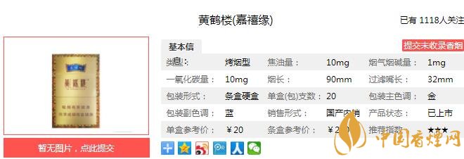 以環神農架地區優質原生態煙葉輔以天然香精香料,以現代工藝增香體質,讓煙氣醇和舒暢,香味優雅細膩,入喉細膩醇和,回味綿長。經香煙網小編市場調查黃鶴樓嘉禧緣售價為20元/包。