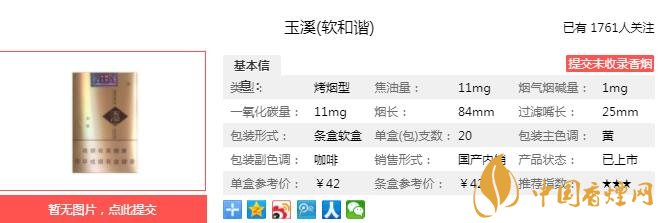 該產品傳承了紅塔產品經典的煙草本香風格,以優質原料與生俱來的自然醇和,雕琢出細膩,豐滿悠長的口感。其包裝整體選用真金色澤,體現高貴而穩重,雅致而親和之感。經香煙網小編市場調查玉溪軟和諧售價為42元/包。
