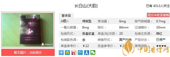 以上便是由香煙網小編為大家介紹的關于長白山天韻多少錢一包 長白山天韻口感及參數介紹的相關信息,想要了解更多有關內容請點擊:白沙硬細支和氣生財好抽嗎 和氣生財價格及參數介紹