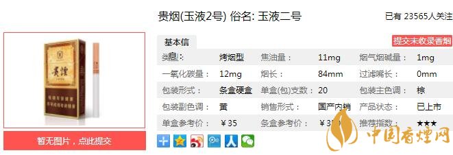 貴煙(玉液2號)科學運用酒中豐富自然香氣成分,通過與天然、原生態(tài)的煙草本香互相配伍,形成豐富、多層次的復合香韻,實現(xiàn)煙香與酒味的共同融合,成卷煙產品保潤增香、口感獨特、回味舒適的特點。經香煙網(wǎng)小編市場調查貴煙(玉液2號)售價為35元/包。