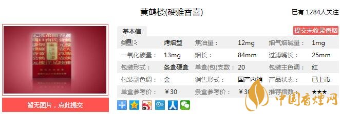 黃鶴樓(硬雅香喜)煙支長(zhǎng)84mm,過濾嘴長(zhǎng)25mm。黃色濾嘴上影印了與煙盒相同的文字圖案,濾嘴下端,豎排印刷的品名“黃鶴樓”與黃鶴樓的圖標(biāo)分居前后兩側(cè),“Huanghelou”的拼音則印在一條較粗的紅圈上。下面我們一起來看黃鶴樓(硬雅香喜)的參數(shù)信息:焦油量:12mg 煙堿量:1.0mg 一氧化碳量:13mg