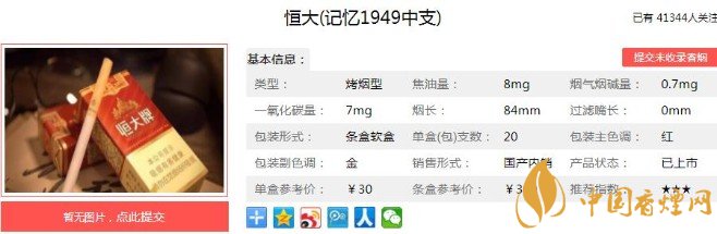 以上便是香煙網小編為大家介紹的關于恒大記憶1949原始香煙包裝,價格還是當年的30元一包!的相關信息,大家看完之后是不是對于這款香煙更加了解呢,想要了解更多內容歡迎點擊:恒大煙魁1903口感測評 百元大佬煙色香味俱全