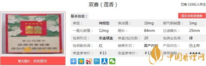 雙喜(蓮香)的過濾嘴設計也很清新脫俗,淺色的煙嘴配上雙喜的logo。從煙支的煙絲端觀察,煙絲顏色深黃,沒有梗夾雜其間,抽一口焦油量也在接受的范圍之內,總體呈現的效果比較好。下面便是這款香煙的基本參數如下:焦油量:10mg 煙堿量:1mg 一氧化碳量:12mg.
