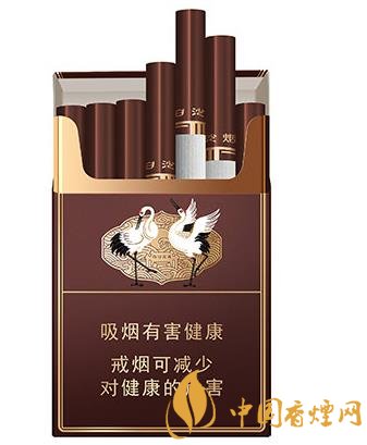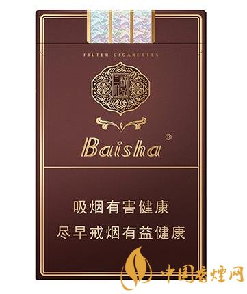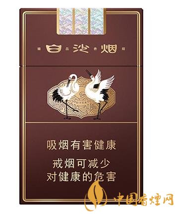 煙盒整體是朱褐色,四邊有兩條的細長的金邊,翻蓋處是“白沙煙”3個金色漢字,每個字中間間隔“精品香煙”4個字。中間是白沙香煙經典的白沙鶴舞圖,兩只白鶴閑庭信步,獨立展翅,配上背景金色的波濤和白沙古井字樣,整個場景顏色搭配巧妙,刻畫細致,白鶴描繪傳神,讓人不由細細觀賞。