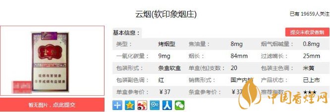 云煙(印象煙莊)系列與云煙重九系列、印象系列同出一脈,香原料均采自石林印象煙莊。煙支風格和重九也很相似,但是卻有著自己的特色。金棕色流紋襯以金紅色云煙行書,黃色的拼音字母,相互襯托出一種檔次感。下面跟著香煙網小編一起來了解云煙(軟印象煙莊)的相關信息吧。