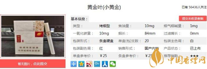 小黃金的濾嘴比較軟,抽到下半段時濾棉有點往內陷,尾段煙香氣息的協調性稍有下降,略有點紊亂之感,但煙氣的總體品質仍是保持在一個與之前很相近的范圍內,煙氣量亦是未見明顯減少。下面便是黃金葉(小黃金)的基本參數:焦油量:10mg 煙堿量:1.0mg 一氧化碳量:10mg.
