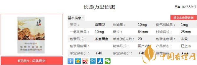 長城(萬里長城)采用特制嘴棒,雪茄的焦油量一般都標(biāo)的是焦中,這款萬里長城卻標(biāo)的是10mg,可以說是一大創(chuàng)新之處。下面便是長城(萬里長城)的基本參數(shù):焦油量:10mg 煙堿量:1.0mg 一氧化碳量:10mg.