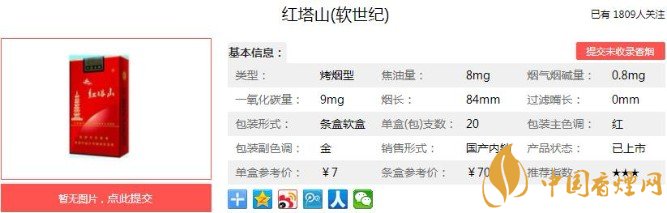 軟世紀香煙秉承以人為本的設計理念,煙氣煙堿量力求達到均衡狀態。煙支采用獨特的煙紙設計,健康環保,還可以使保存的時間更久。下面便是紅塔山(軟世紀)的基本參數:焦油量:8mg 煙堿量:0.8mg 一氧化碳量:9mg.