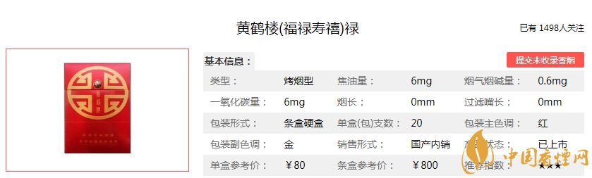 黃鶴樓福祿壽喜四款香煙均采用紅底色,金色字外觀設計,帶給人們喜慶,大氣,有檔次的品位。煙支規格都為84MM,每條10盒包裝,單價均為80元/包。