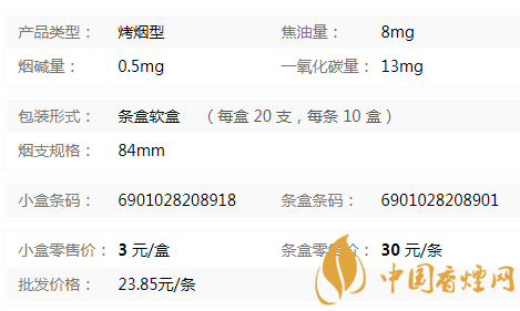 | 煙長:84mm | 過濾嘴長:20mm | 包裝形式:條盒軟盒 | 單盒(包)支數(shù):20 |