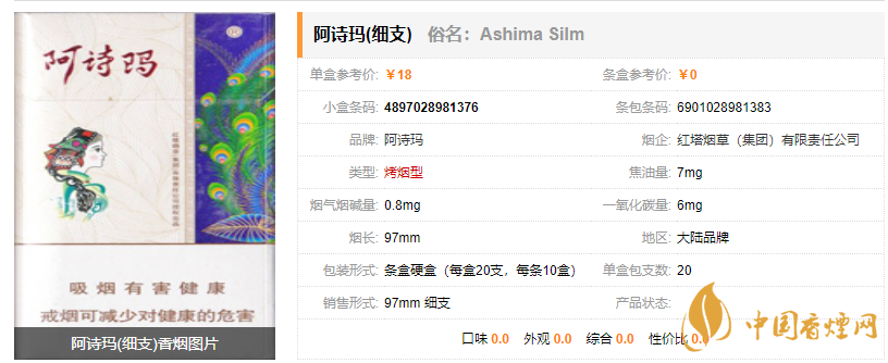 阿詩瑪(細支)香煙價格表圖 阿詩瑪(細支)煙價格多少錢一包