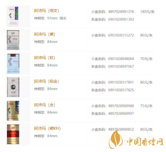 2020年阿詩瑪香煙價格表圖
