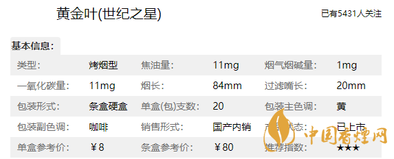 黃金葉香煙品牌定位為中式經典醇香型烤煙,一烤透本香、二烤出凈香、三烤成醇香是它的工藝,這款世紀之星也是完美的繼承了品牌的意志,這款香煙品質方面非常的好,那么我們在介紹這款黃金葉香煙價格表和圖片之前,先來了解一下黃金葉世紀之星多少錢一盒,它的零售參考價為8元/包。