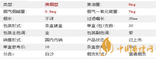 | 類型 :烤煙型 | 焦油量 :6mg | 煙氣煙堿量 :0.6mg | 一氧化碳量 :7mg |