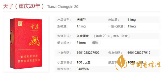 重慶天子20年采用津巴布韋優質煙葉和武陵生態煙葉,手工精選頂級煙葉。下面一起來看下天子重慶20年的具體參數:一盒20支,煙長84mm,焦油量11mg,煙堿量1.1mg,一氧化碳量11mg。