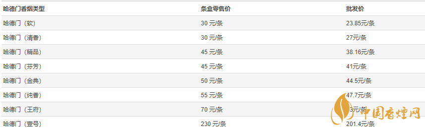 哈德門產品系列共有八種香煙產品,其中除了哈德門(壹號)每條零售價是230元之外,其他的七種香煙產品,條盒零售價基本都是在30至55元之間,由于每條10盒,所以,每小盒的價格即在3至5元左右。可見,哈德門香煙的價格是比較低廉的,也符合它“民品之名品”的稱號。