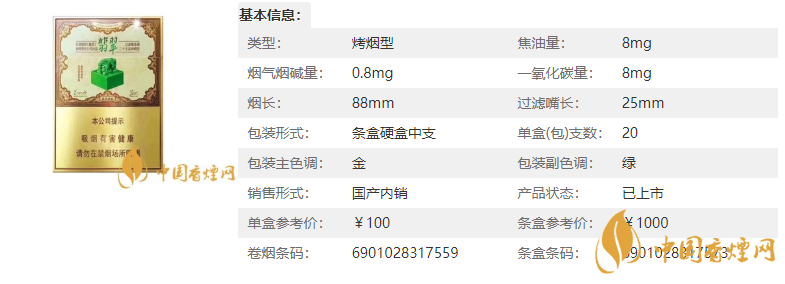 類型 :烤煙型 焦油量 :8mg 煙氣煙堿量 :0.8mg 一氧化碳量 :8mg