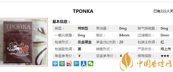 TPONKA(三套車)香煙是俄羅斯的香煙品牌,由于俄羅斯香煙都存在一個特點,也許是戰斗名族特有的吧,他們的香煙都是非常的烈的,那么在了解俄羅斯TPONKA香煙價格表之前,先來看一看tponka香煙多少錢一包,這款香煙的參考價為15元/包。
