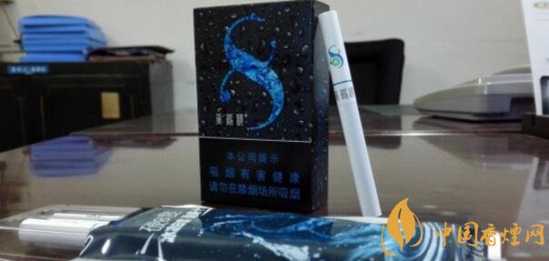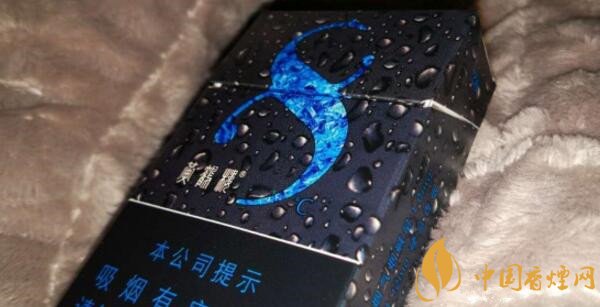 這款香煙正面外觀來(lái)看給人的第一印象它就是一款涼煙,炫酷純黑的底色搭配晶亮水滴為主色調(diào),同時(shí)冰藍(lán)顏色的抽象冰塊圖案形成了一個(gè)數(shù)字“8”形狀,讓人覺(jué)得涼爽的同時(shí)也突出了產(chǎn)品LOGO。