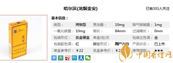類型 :烤煙型 焦油量 :10mg 煙氣煙堿量 :1mg 一氧化碳量 :10mg