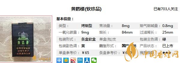 黃鶴樓軟珍品,作為黃鶴樓系列的高檔香煙,這款煙民中口碑上佳的“軟珍品”香煙,放眼國(guó)烤60檔市場(chǎng),除了此檔次中的霸主軟中外,黃鶴樓軟珍、芙蓉王軟藍(lán)、云煙棕印象可算是此檔次中的三杰,那么在對(duì)黃鶴樓軟珍品圖片價(jià)格進(jìn)行介紹之前,先來(lái)看一看黃鶴樓軟珍品多少錢一包,這款香煙的價(jià)格為65元/包。