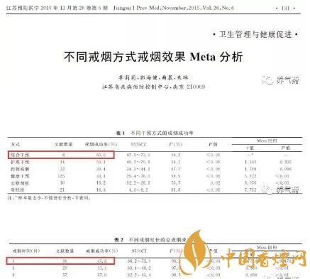 2015年江蘇省疾病預防控制中心統計了1989-2014年之間的208項戒煙研究記錄,結果表明:以藥物干預+健康干預的綜合干預方式效果最好,戒煙用時越短越好。