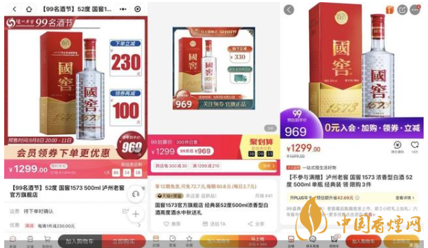 事實上,由于茅臺價格持續拉高,從而為五糧液、瀘州老窖等一線酒企的高端產品讓出價格調整空間。但細觀消費市場,國窖1573的價格并沒有完全突破千元。北京商報記者發現,52度500ml國窖1573經典裝官方旗艦店原價1499元/瓶,活動售價1299元/瓶。反觀其他電商平臺,該產品活動售價大多在1000元左右。其中,天貓旗艦店此前售價為1299元,活動售價僅969元;1919平臺此前售價為1399元,活動售價999元;酒仙網、蘇寧易購等活動售價為909元和969元。