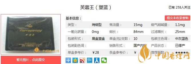芙蓉王塑藍煙支長84mm,過濾嘴長:25mm,包裝設計大氣精致,十支包裝突顯此煙的與眾不同,可謂支支珍貴。下面我們一起來看芙蓉王塑藍的參數信息:焦油量:15mg 煙堿量:1.1mg