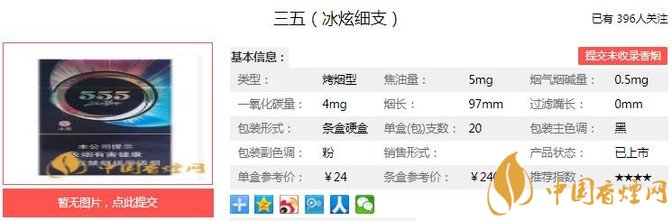 三五冰炫細(xì)支煙支長97mm,過濾嘴長不詳,定位在細(xì)支煙品類。煙支很飽和,煙嘴也是網(wǎng)狀圖案,在上方有個(gè)和外盒爆珠圖案一樣的,標(biāo)注的是爆珠位置,煙嘴與煙支分隔處是一條細(xì)紫色和一條寬銀色圍繞起來,在銀圈上有555字標(biāo)。下面我們一起來看三五冰炫細(xì)支的參數(shù)信息:焦油量:5mg 煙堿量:0.5mg 一氧化碳量:4mg