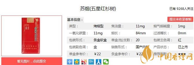 三、蘇煙五星紅杉樹香煙參數