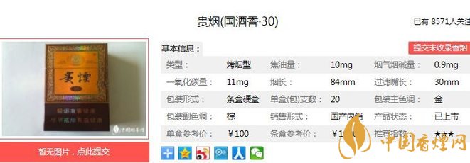 貴煙國酒香30品吸時將煙和酒兩種口感結合起來,給人一種全新的口感享受。讓業界側目的是,自貴煙(國酒香·30)率先上市后第一時間便取得了喜人銷量和良好口碑,產品供不應求。經香煙網小編市場調查貴煙國酒香30售價為100元/包。