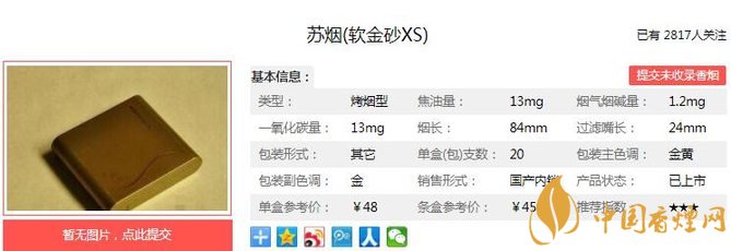 蘇煙軟金砂XS其實塑盒內放置的煙支就是蘇煙軟金砂,只是換了個精致的包裝而已。目前已經停產,市面上比較少見,但卻時不時能遇到閑置的,其中以帝都居多,包裝十分有檔次。經香煙網小編市場調查蘇煙軟金砂XS售價為48元/包。