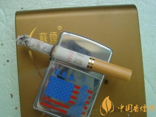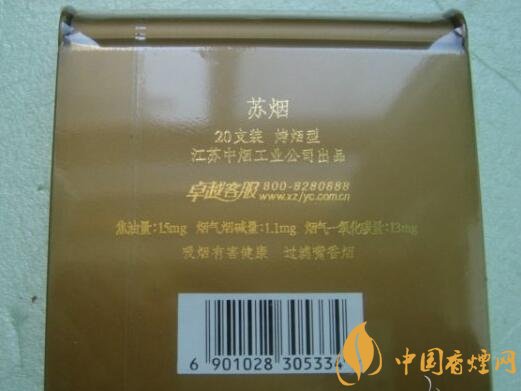 暗金色塑盒包裝,主體為方形,上下兩側作弧形處理,給人以輕巧圓潤之感。正面左側一道極似女人身體曲線的“S”形劃過,旁邊有繁寫的“蘇煙”二字,右下方是“江蘇中煙工業公司出品”,設計簡約,表意婉約。背面標有商品的基本信息(包括三項理化指標、條形碼等)和警示語。其余四面皆無文字或圖案。