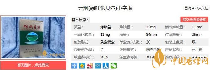 三、云煙綠呼倫貝爾小字版香煙參數