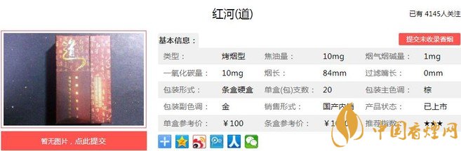 紅河道煙支長84mm,過濾嘴長35mm,煙支造型是不太常見的小方格,煙絲填充飽滿。煙嘴、煙支的包裝工藝都是首屈一指,高端產(chǎn)品的形象一覽無遺。下面我們一起來看紅河道的參數(shù)信息:焦油量:10mg 煙堿量:1.0mg 一氧化碳量:10mg
