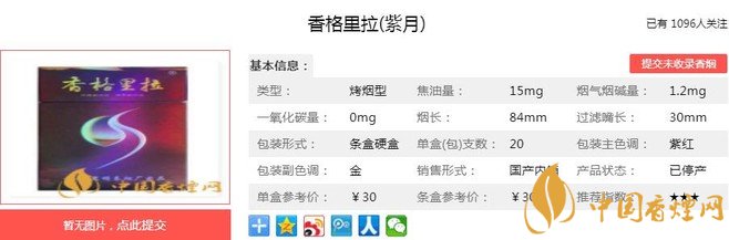 香格里拉紫月用料考究,加工精細品質出眾,是昆煙繼云煙珍品之后推出的又一高品質產品。這款煙包裝漂亮,煙氣醇厚、本香十足,給力的15焦給人較強的滿足感,但煙氣的順滑度較差,入口有辣感,目前已經停產下市。經香煙網小編市場調查香格里拉紫月售價為30元/包。