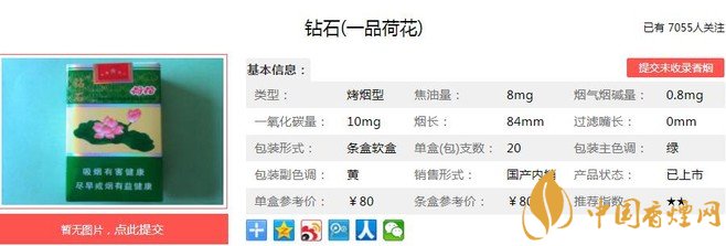 鉆石一品荷花于2014年上市,在高端卷煙市場占用很大的份額,濃淡適中的香氣,勁頭適中成為很多人的口糧。清雅脫俗的包裝設計更讓人愛不釋手,經香煙網小編市場調查鉆石一品荷花售價為80元/包。