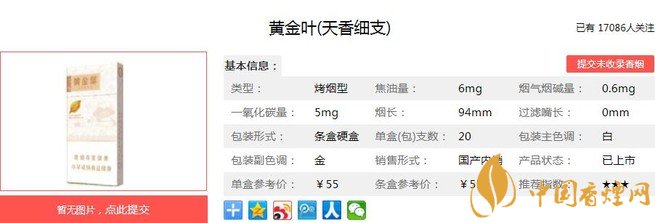 黃金葉天香細支類別為“高一類A(細支)潛力規格”,烤煙類型。外包裝沿襲天葉低調奢華的品系風格,一如既往的黃金標準,一絲不茍的手捻精神,和大小天葉系列一脈相承,據香煙網小編市場調查它的零售參考價為55元/包。