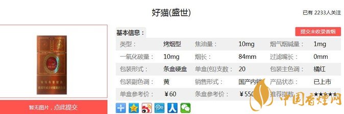 好貓盛世以高香低危害為主要設計方向,主要原料精心選用自然醇化兩年以上的云南、津巴布韋煙葉,突出產品優雅的清香,煙香豐富諧調。在香料配方中首次采用具有生物減害技術的中草藥“豐和液”,使有害氣體得以轉移降解,達到了“生津不起痰,回甜不口干”的良好效果。經香煙網小編市場調查好貓盛世售價為60元/包。